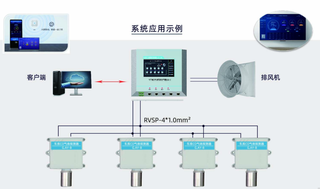 車庫CO 風機智控管理系統主要由 G.AY-AX(車庫CO報警控制箱,內含G.AY-A車庫CO風機控制器)、G.AY-B(庫CO氣體探測器)構成。GAY-B(車庫 CO 氣體探測器)安裝在車庫的各個位置,實時監測空氣中的 CO 濃度變化,并通過有線方式傳輸到 G,AY-A(車庫 CO 風機控制器),GAY-A(車庫 CO 風機控制器)根據采集到的各個一氧化碳分控制器的濃度值與設定的報警值進行比較,若超過報警值主控制器則啟動風機進行排風。